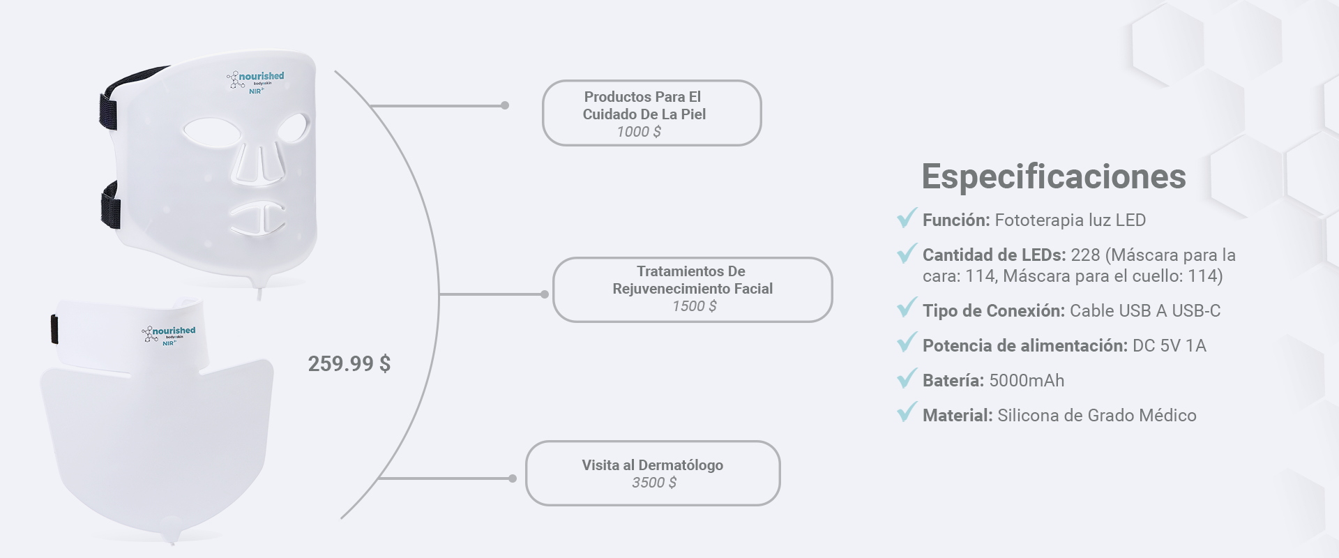 | Cantidad de LED: | 228 (Mascarilla facial: 114, Mascarilla de cuello: 114) |