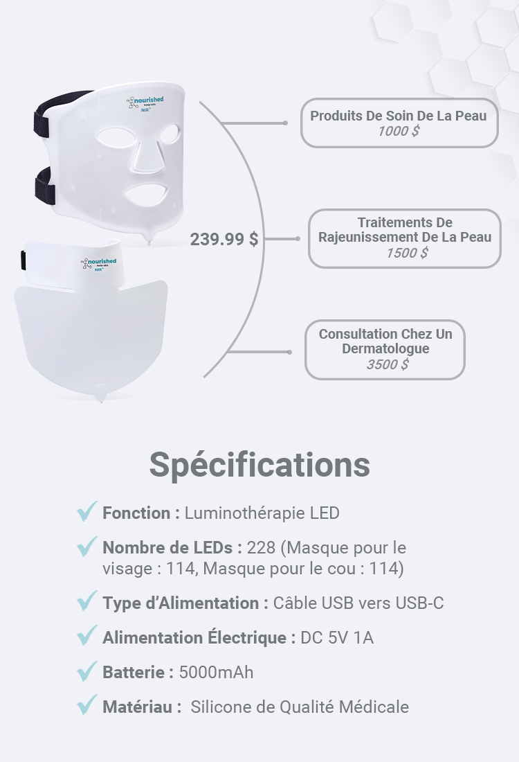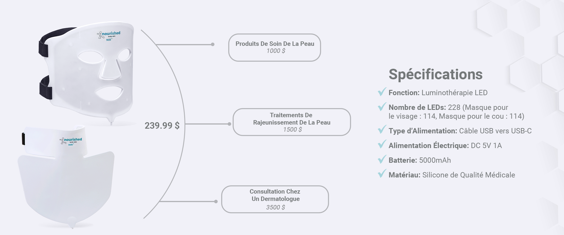 Votre partenaire ultime pour les soins de la peau est là. Notre ensemble LED visage et cou à 7 modes offre une expérience de thérapie par lumière à spectre complet—désormais encore plus puissante grâce à la technologie proche infrarouge.