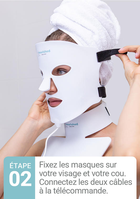 Nos masques LED visage et cou Nourished Bodynskin sont conçus pour fonctionner sans fil, ce qui signifie qu'ils n'ont pas besoin d'être branchés à une prise fixe pendant l'utilisation. Ils sont alimentés par une télécommande rechargeable. Pour fonctionner, les masques doivent être connectés à la télécommande via un câble, ce qui vous permet de régler la puissance, la durée, la couleur de la lumière et l'intensité.