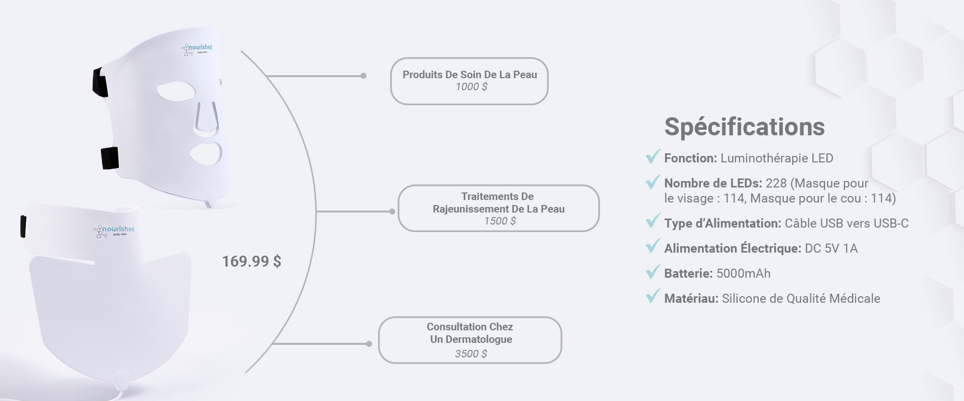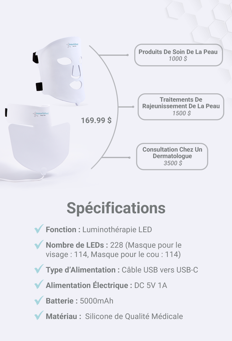 | Quantité de LED : | 228 (Masque facial : 114, Masque pour cou : 114) |