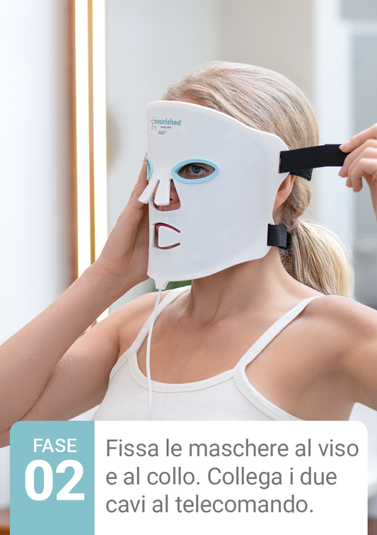 Le nostre Maschere LED per Viso e Collo Nourished Bodynskin sono progettate per funzionare senza fili, il che significa che non devono essere collegate a una presa fissa durante l'uso. Sono alimentate da un telecomando ricaricabile. Per funzionare, le maschere devono essere collegate al telecomando tramite un cavo, che consente di regolare potenza, tempo, colore della luce e intensità. Per caricare il telecomando, basta collegarlo a un adattatore di alimentazione USB (5V 1A, per almeno 3-4 ore) usando il cavo USB-C a USB incluso. Lasciate che il telecomando si carichi fino a quando la batteria è piena, come indicato sul display. Ricordate di non collegare direttamente la Maschera Viso o Collo a un caricatore USB.