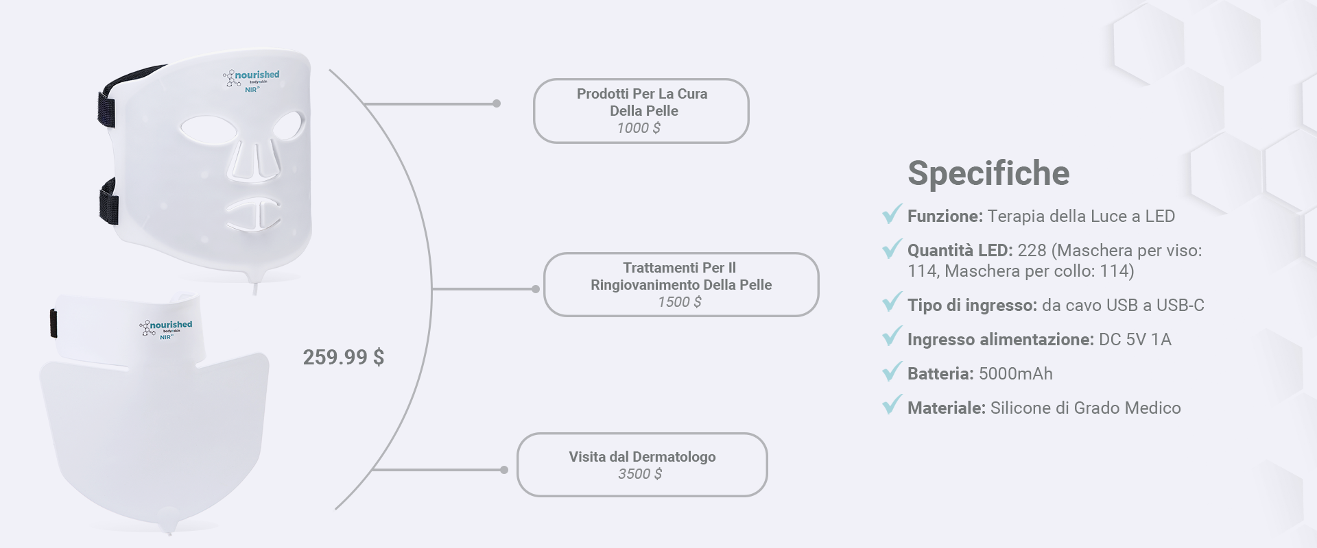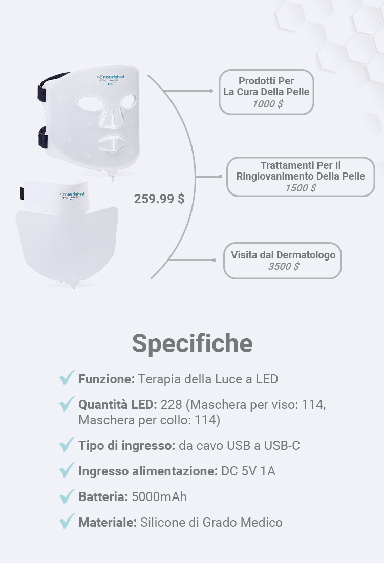 | Quantità LED: | 228 (Maschera per il viso: 114, Maschera per il collo: 114) |