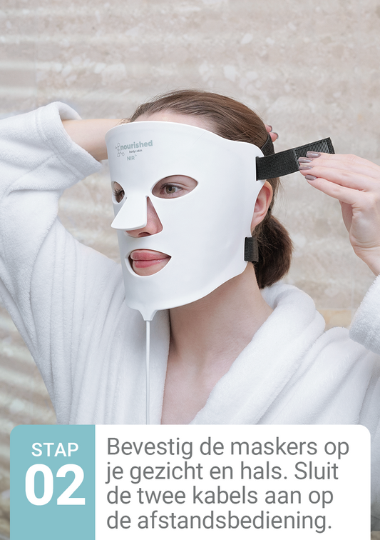 Onze Nourished Bodynskin LED Gezichts- en Nekmaskers zijn ontworpen voor draadloze werking, wat betekent dat ze tijdens gebruik niet op een vaste stroomvoorziening hoeven te worden aangesloten. In plaats daarvan worden ze gevoed door een oplaadbare afstandsbediening. Om te functioneren moeten de maskers via een kabel met de afstandsbediening verbonden zijn, waarmee u het vermogen, de tijdslimiet, de lichtkleur en de intensiteit kunt aanpassen.