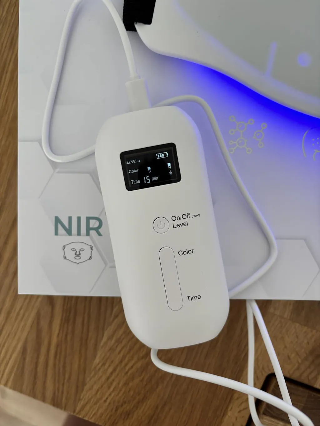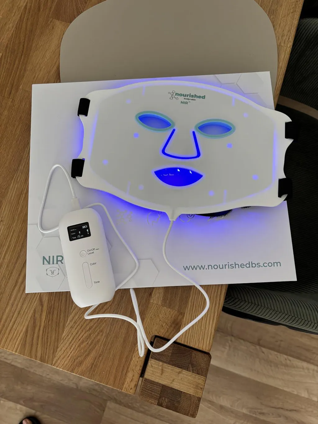 I haven’t had it long enough to say if it makes a difference or not, but the device is well-packaged with clear instructions. The straps are simple but work fine and allow for a range of adjustments on your face. The eye pieces supplied work well, though I do wish they covered less of the bit below the eye so the light can reach it. The controller is very easy to use and also the power pack, so no need to plug it in when using it — you can walk around with it in your pocket whilst you do other things! My only gripe is it would be better if you could adjust the time up and down (instead of just up), and if it remembered the time you previously selected.