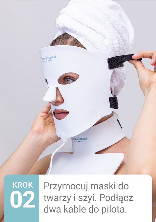 Nasze maski LED na twarz i szyję Nourished Bodynskin są zaprojektowane do pracy bezprzewodowej, co oznacza, że nie muszą być podłączone do stałego gniazdka podczas używania. Zasilane są przez ładowalny pilot zdalnego sterowania. Aby działały, maski muszą być połączone z pilotem za pomocą kabla, co pozwala na regulację mocy, limitu czasu, koloru światła i intensywności.