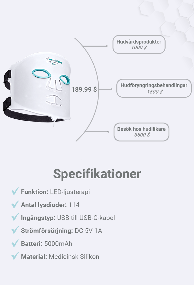 Nourished Bodynskin LED-masker har ett irradiansvärde på cirka 35 mW/cm², vilket säkerställer säker och effektiv behandling utan uppvärmning eller oönskade biverkningar. Våra LED-masker är lämpliga för alla hudtyper och erbjuder de kraftfulla läkande effekterna av LED-ljusterapi utan UV-exponering.